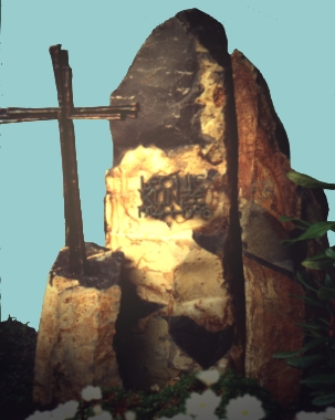 Eine Gruppe Basalt-Säulen mit Bronze Schriftzug und Kreuz.